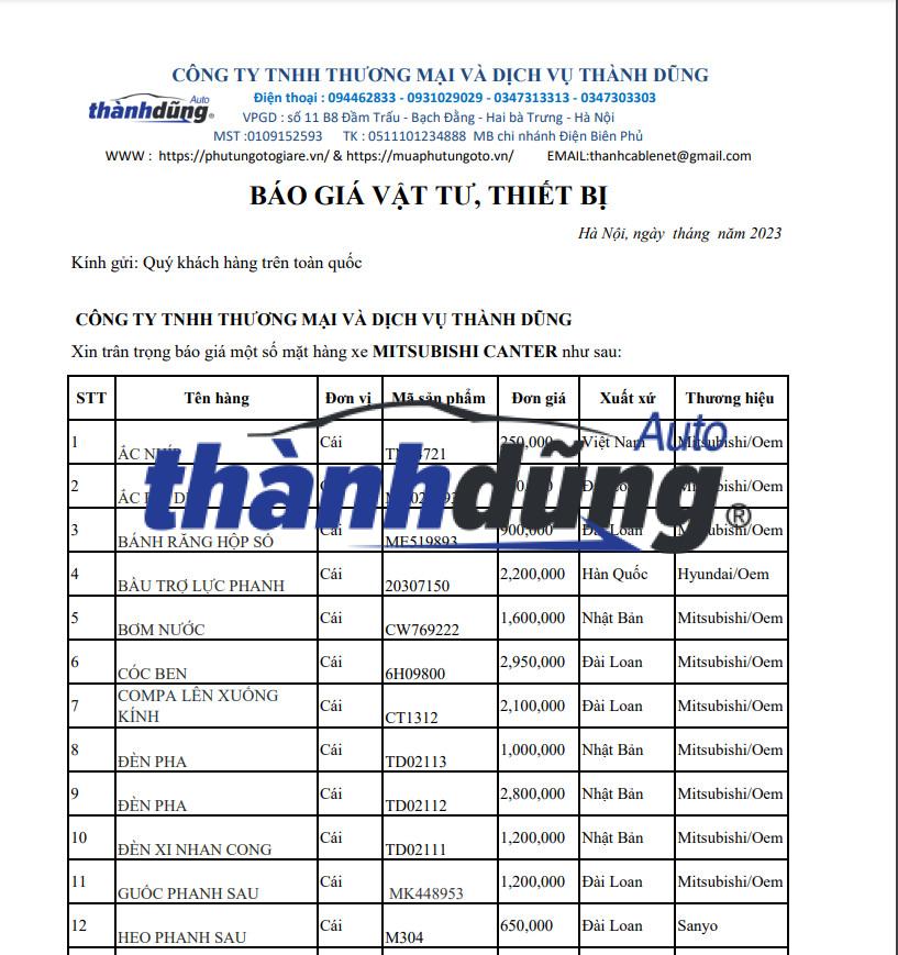 Thành Dũng Auto xin gửi bảng báo giá chi tiết phụ tùng xe Mitsubishi Canter