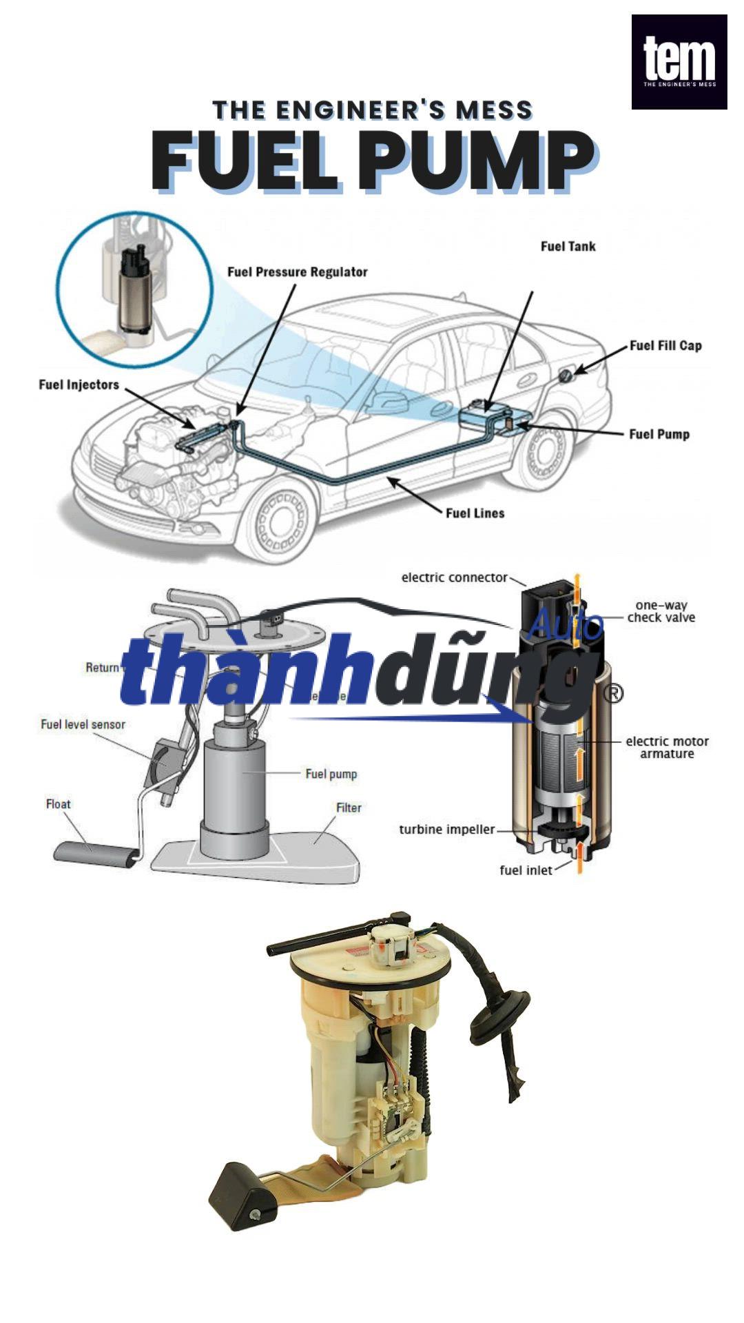Cụm bơm xăng: khi mở khóa khởi động xe hơi, hệ thống xử lý trung tâm ECU sẽ kích hoạt rơ le để cung cấp điện cho bơm xăng. Bơm hút xăng từ bình xăng đi qua van 1 chiều, lọc xăng để đến kim phun. Van một chiều đóng vai trò duy trì áp suất dư bên trong hệ thống khi bơm không làm việc. Lọc xăng đóng vai trò làm sạch xăng, giữ lại rỉ sắt, các chất rắn làm hạn chế tình trạng tắc kim phun. Van điều áp có vai trò duy trì áp suất ổn định trên hệ thống, trường hợp xăng thừa sẽ được hồi về bình chứa xăng.