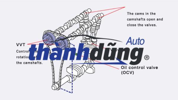 Van điều khiển dầu dàn cam VVTi có nguyên lý hoạt động: Khi động cơ hoạt động, ECU (bộ điều khiển điện tử) sẽ gửi tín hiệu đến van điều khiển dầu để điều chỉnh lượng dầu dẫn đến piston. Áp suất dầu tác dụng lên piston sẽ làm cho piston di chuyển, kéo theo đó là sự thay đổi góc xoay của trục cam. Làm sớm van nạp: Khi cần tăng công suất ở vòng tua cao, ECU sẽ tăng áp suất dầu, đẩy piston đi xa hơn, làm cho trục cam xoay sớm hơn, van nạp mở sớm hơn. Điều này giúp tăng lượng không khí nạp vào xi-lanh, tăng hiệu suất đốt cháy. Làm muộn van nạp: Ngược lại, khi cần tăng mô-men xoắn ở vòng tua thấp, ECU sẽ giảm áp suất dầu, piston di chuyển gần lại, trục cam xoay muộn hơn, van nạp mở muộn hơn. Điều này giúp tăng áp suất nén trong xi-lanh, cải thiện mô-men xoắn.